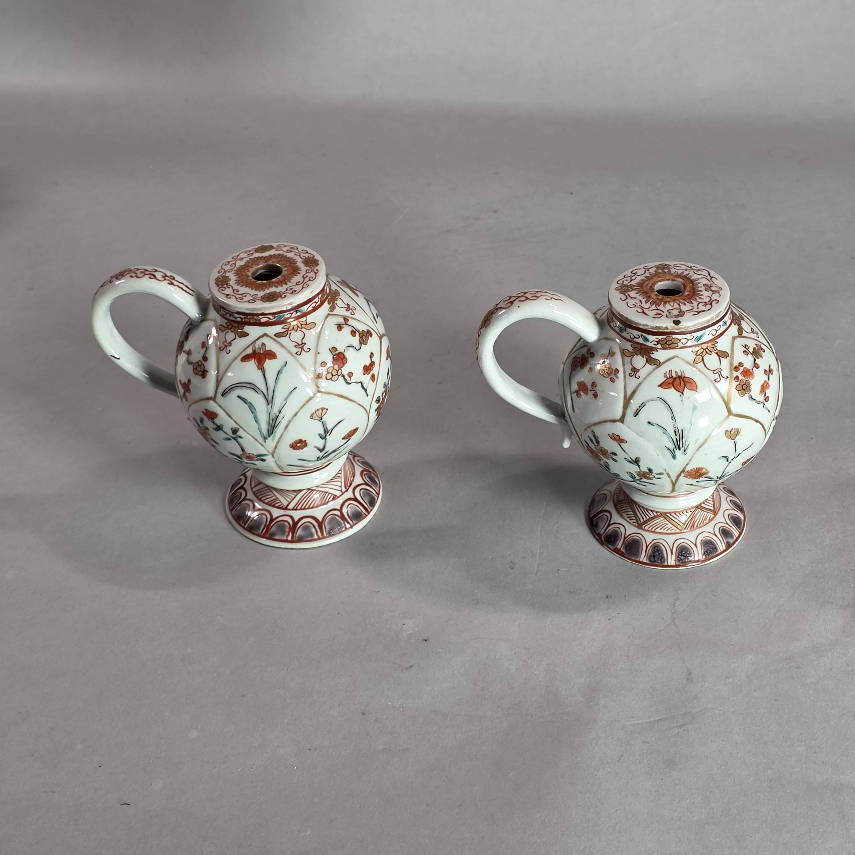 Each globular form moulded with petals, painted in polychrome enamels with panels of flowers in the Kakiemon palette, highlighted in gilding, above a domed foot, loop handle with spur, the flat circular narrow neck with iron-red and gilt stylised flowers and scroll, pierced cover,