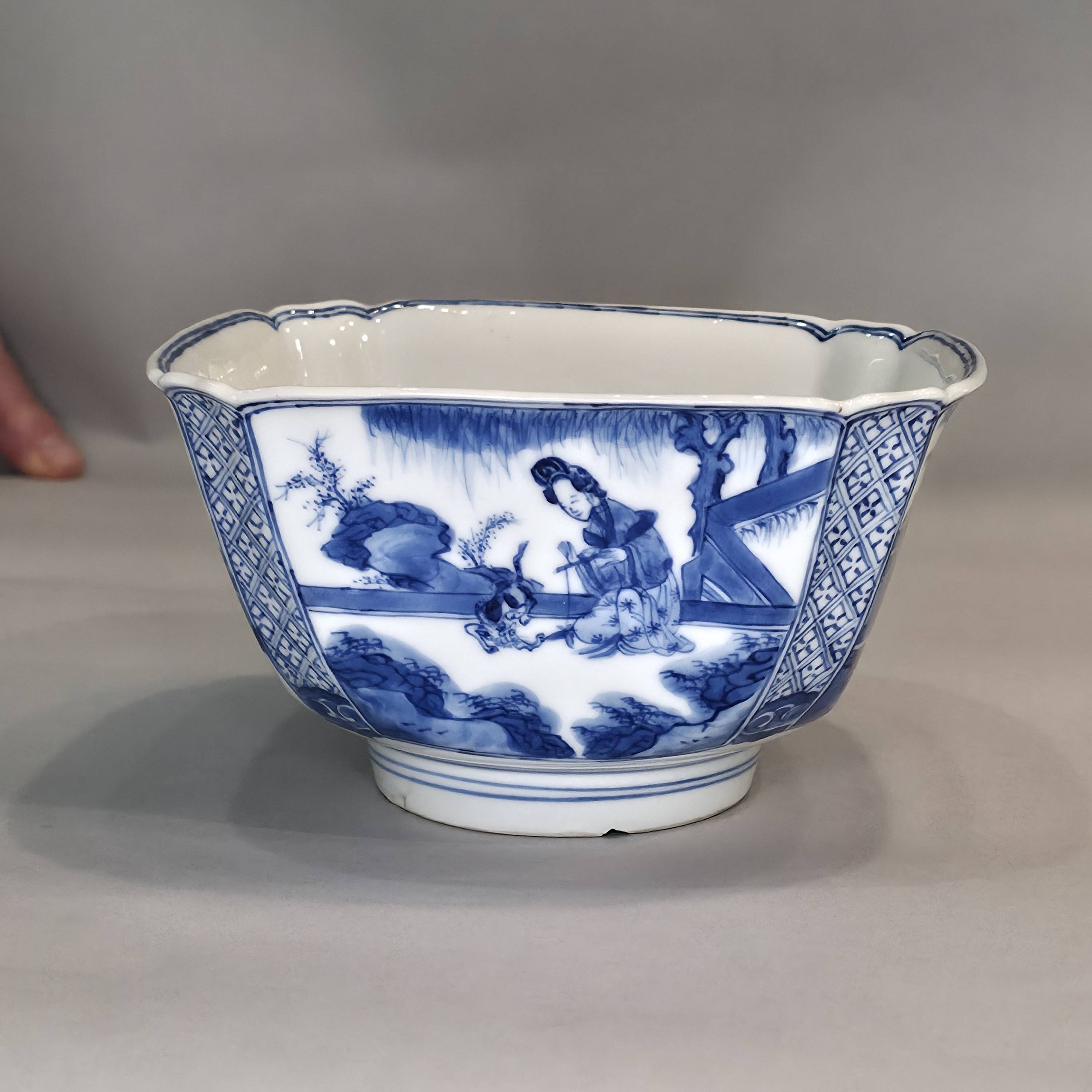 Chinese blue and white four-sided bowl, Kangxi (1662-1722), of square cross-section with canted corners, each of the four sides decorated with a panel containing elegant ladies relaxing in a garden setting with rockwork and bamboo, engaged in various activities including playing the flute, painting and playing with a cat; with narrow panels to each corner with a diaper-pattern ground and large ruyi-heads rising to a lobed rim; the interior with a single blue line to the rim, the base with a Kangxi six-character mark and of the period.
