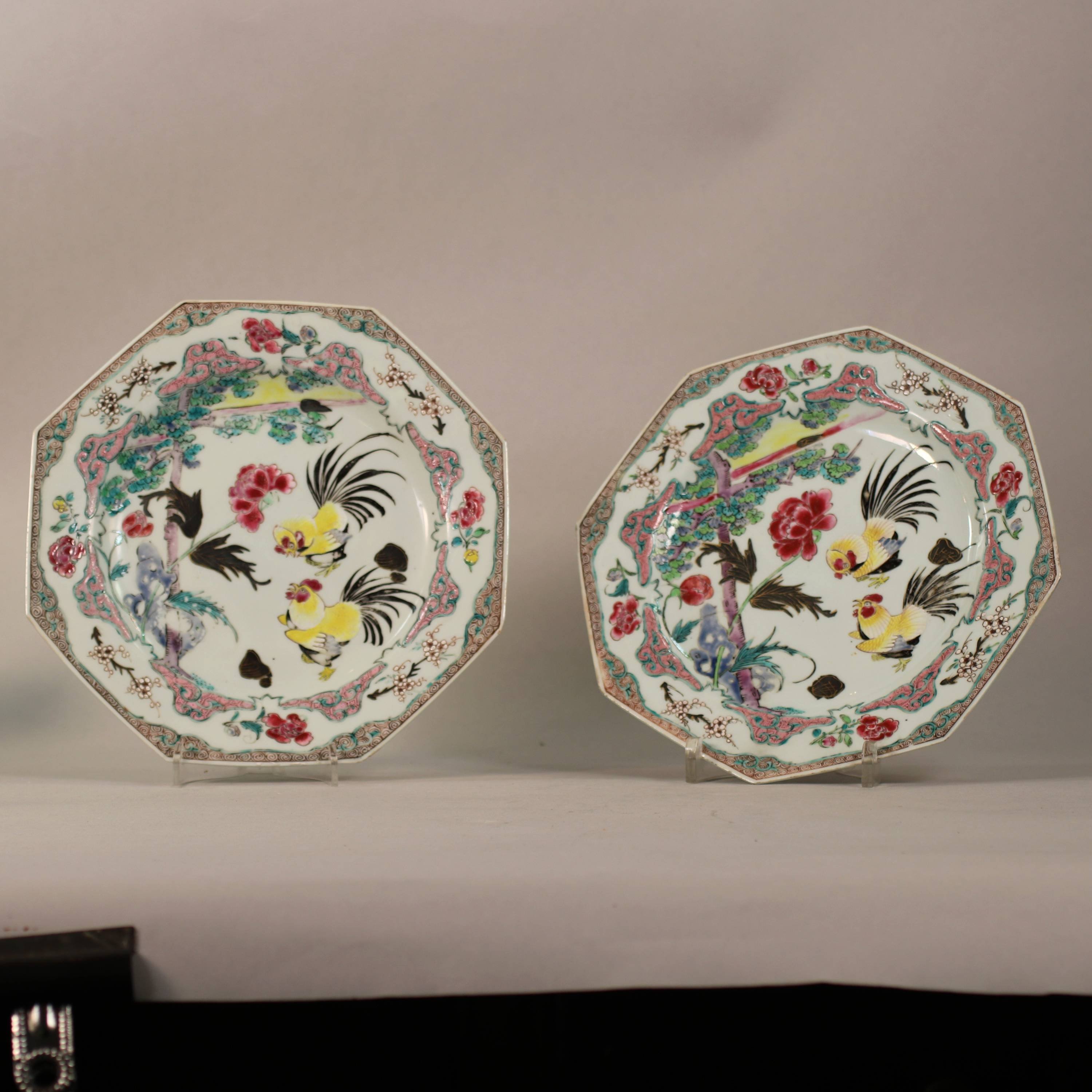 Pair of octagonal famille rose plates early Qianlong(1736-1795), decorated in bright famille rose enamels, the centre with cockerels a tree and flowers, the rim with scrolling flowers and