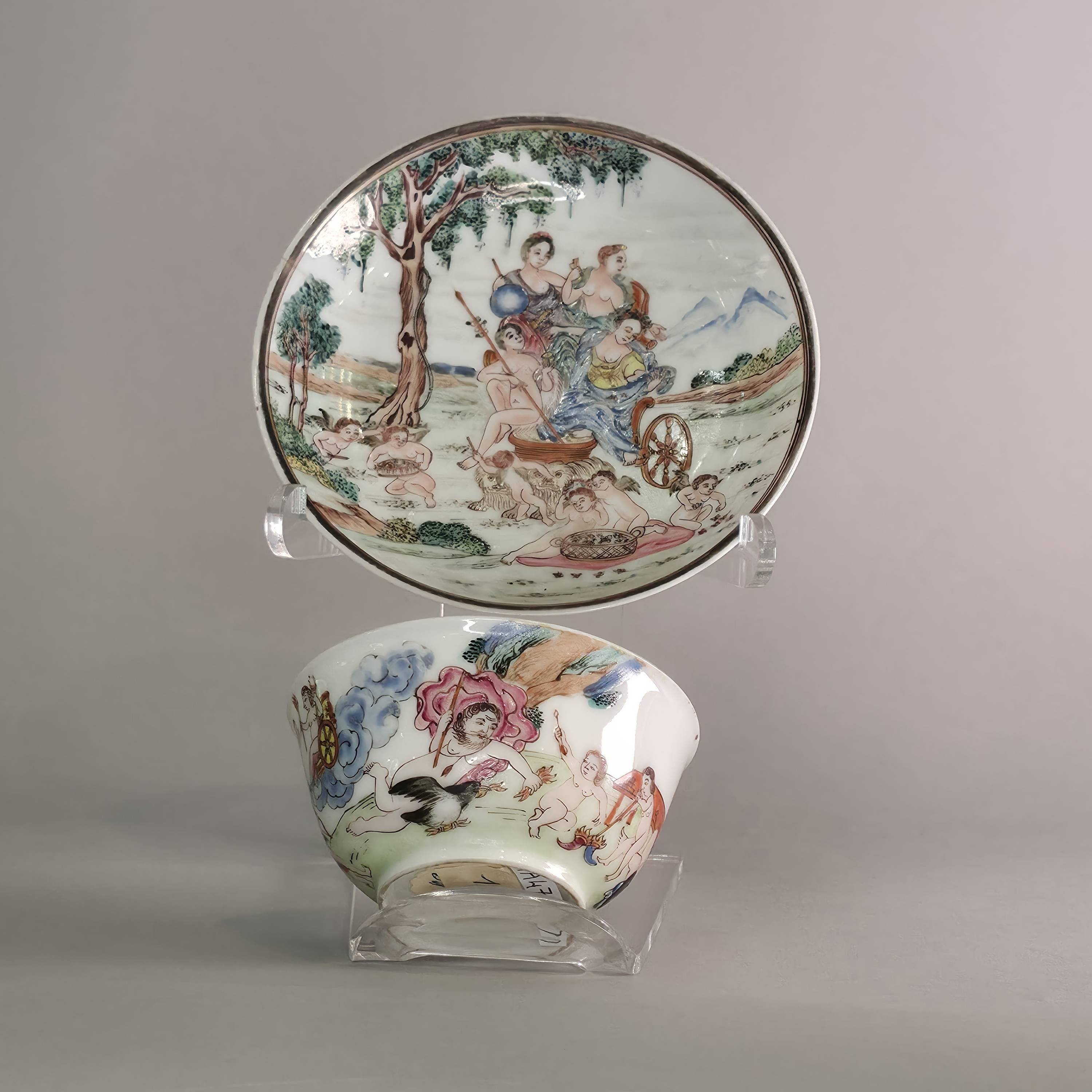 Decoration is based on paintings by Francesco Albani (1578-1660) commissioned for the Borghese Palace, Rome. Albani painted a set of four mythological scenes representing the elements for the palace and later produced three variant series, the best-known being for Cardinal Maurice of Savoy in 1635, now in the Turin Museum. The popularity of such scenes and their rendering by various engravers made them a popular subject choice for export porcelain. For a similar example see William R. Sargent 'Treasures of Chinese Export' Yale 2012, p. 297