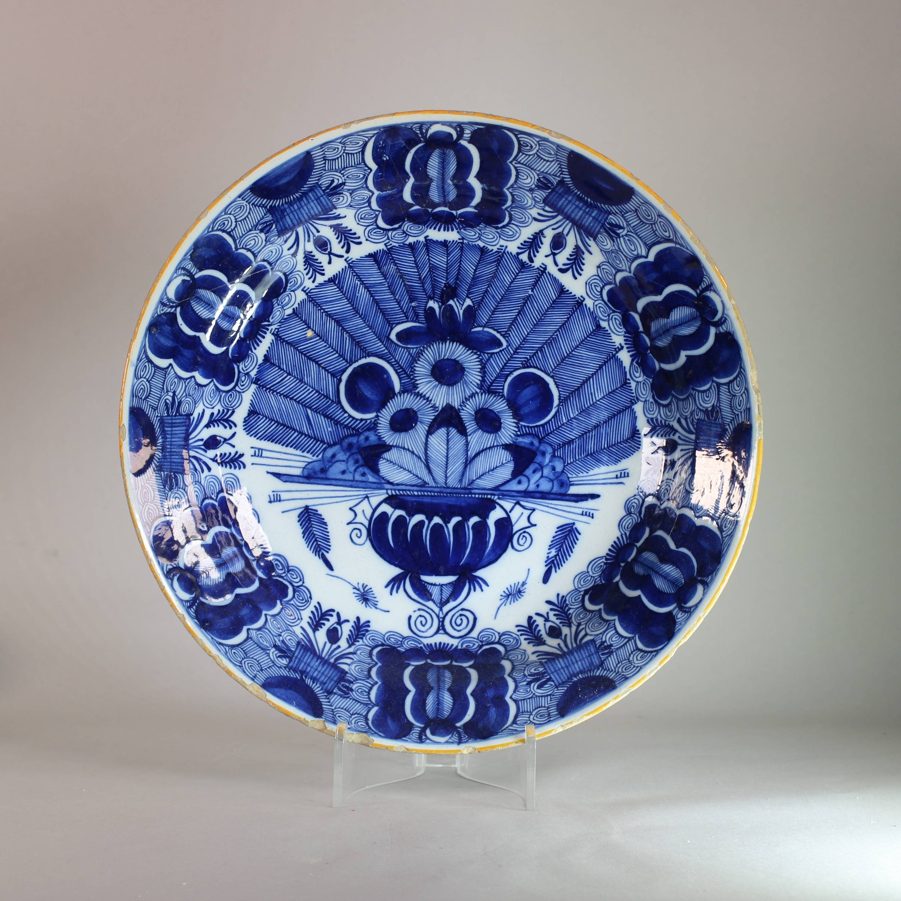 Dutch delft blue and white peacock dish, 18th century, with an ochre rim, decorated to the centre in cobalt oxide with an urn containing an arrangement of flowers and peacock feathers, the rim with a wide band of stylised flower heads, seed pods and grasses against a scrolling ground, the reverse with a ‘De Claeuw’ mark and number 300 and number 5.to base. Diameter: 34.8cm. (13 3/4in.); condition: Chips and frits to yellow and white rim (for a similar dish see W861)
