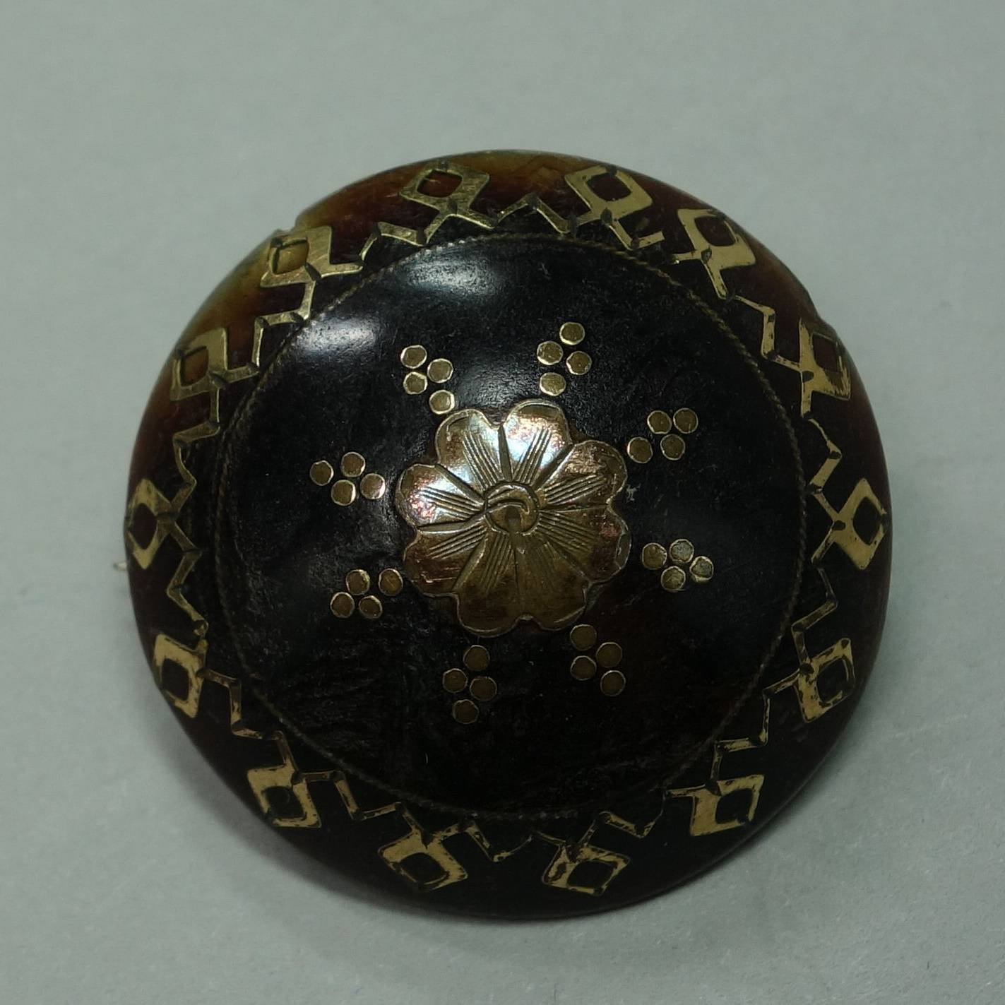 Victorian gold and tortoiseshell pique brooch, circa 1870, inlaid with gold, decorated with a central flower, bordered by a band of geometric pattern, diameter: 1in., 2.5cm.