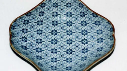 Konnyaku dish 1 This unusual Arita export dish can be dated in three different ways: by the stencilled deer, by the konnyaku stamped groups of leaves, and by the piecrust-moulded wave-border....